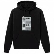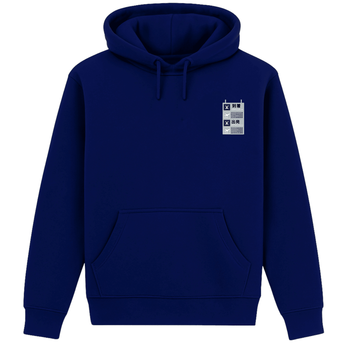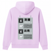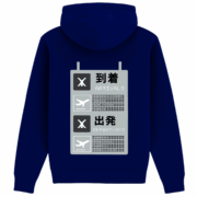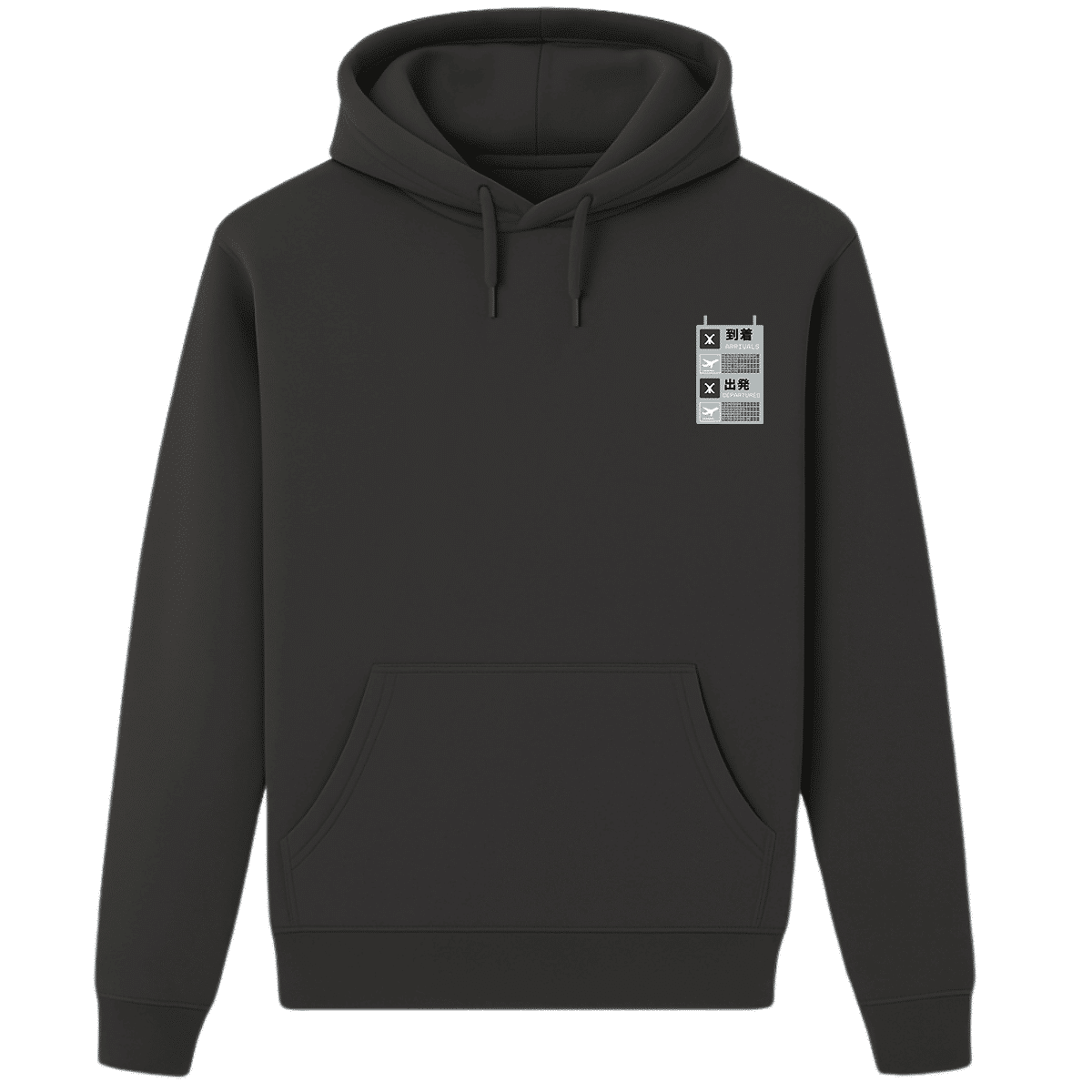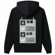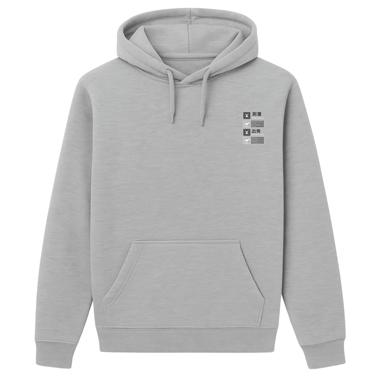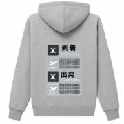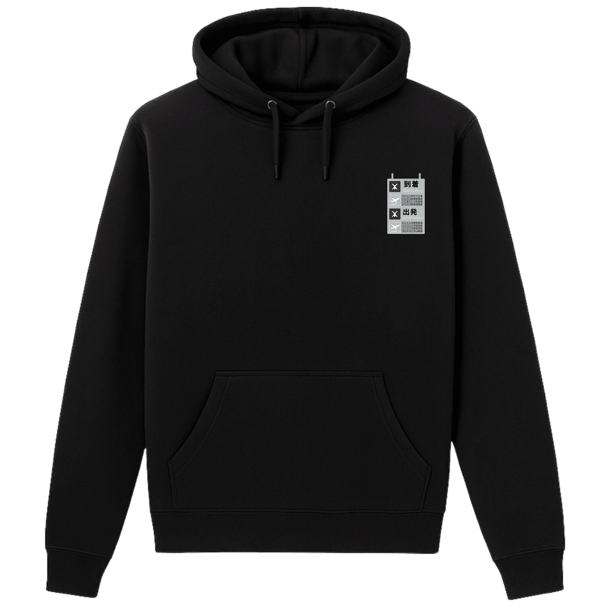 Wie ein letzter Aufruf zum Gate: Dieser Hoodie bringt die Ästhetik alter Flughäfen mit japanischer Symbolik und dem Radschläger zusammen – urban, reduziert, charakterstark.