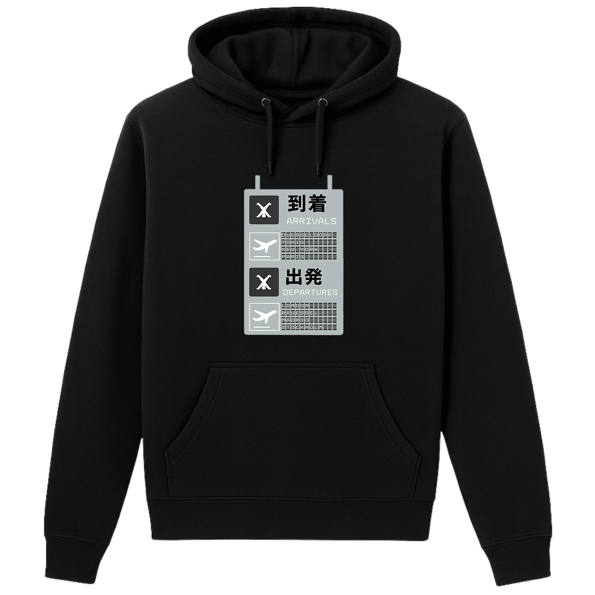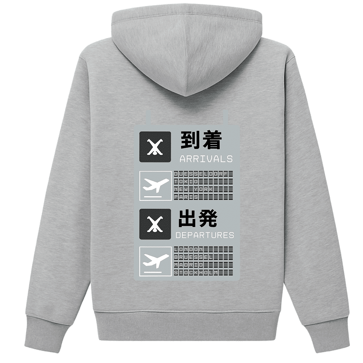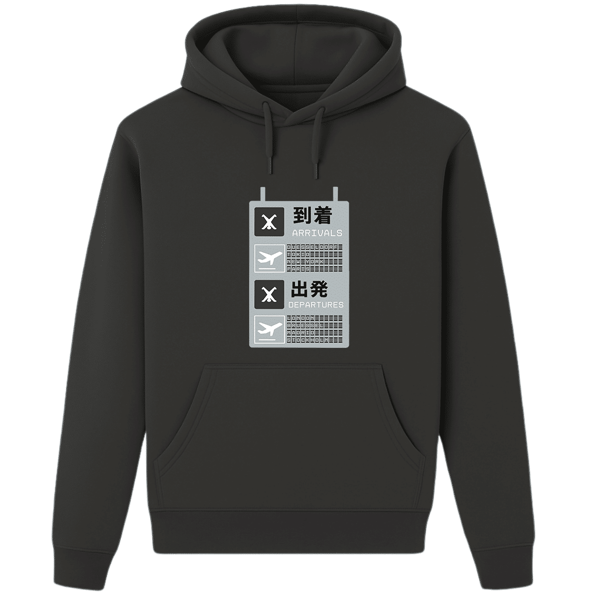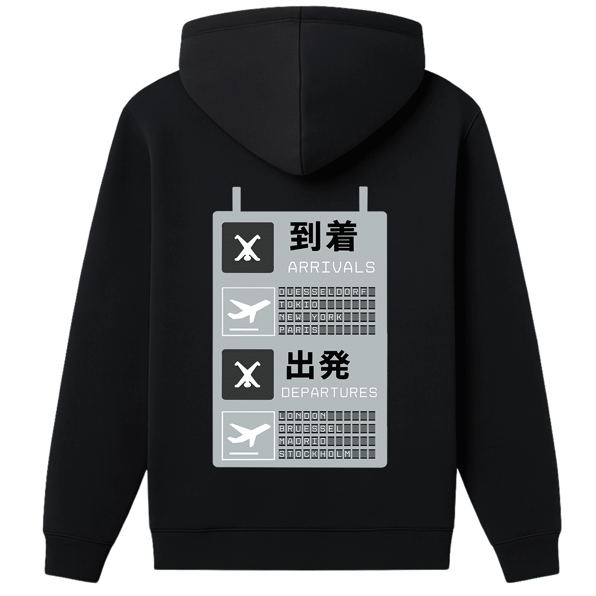 Für Globetrotter, Vielflieger und alle, die Fernweh lieben: Der Arrivals & Departures Hoodie bringt den coolen Look einer Anzeigetafel direkt in deinen Streetwear-Style.