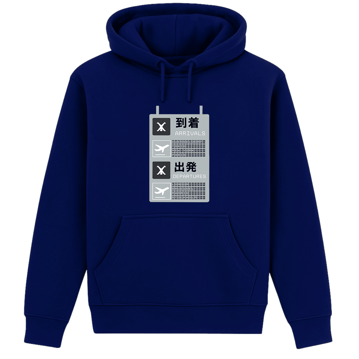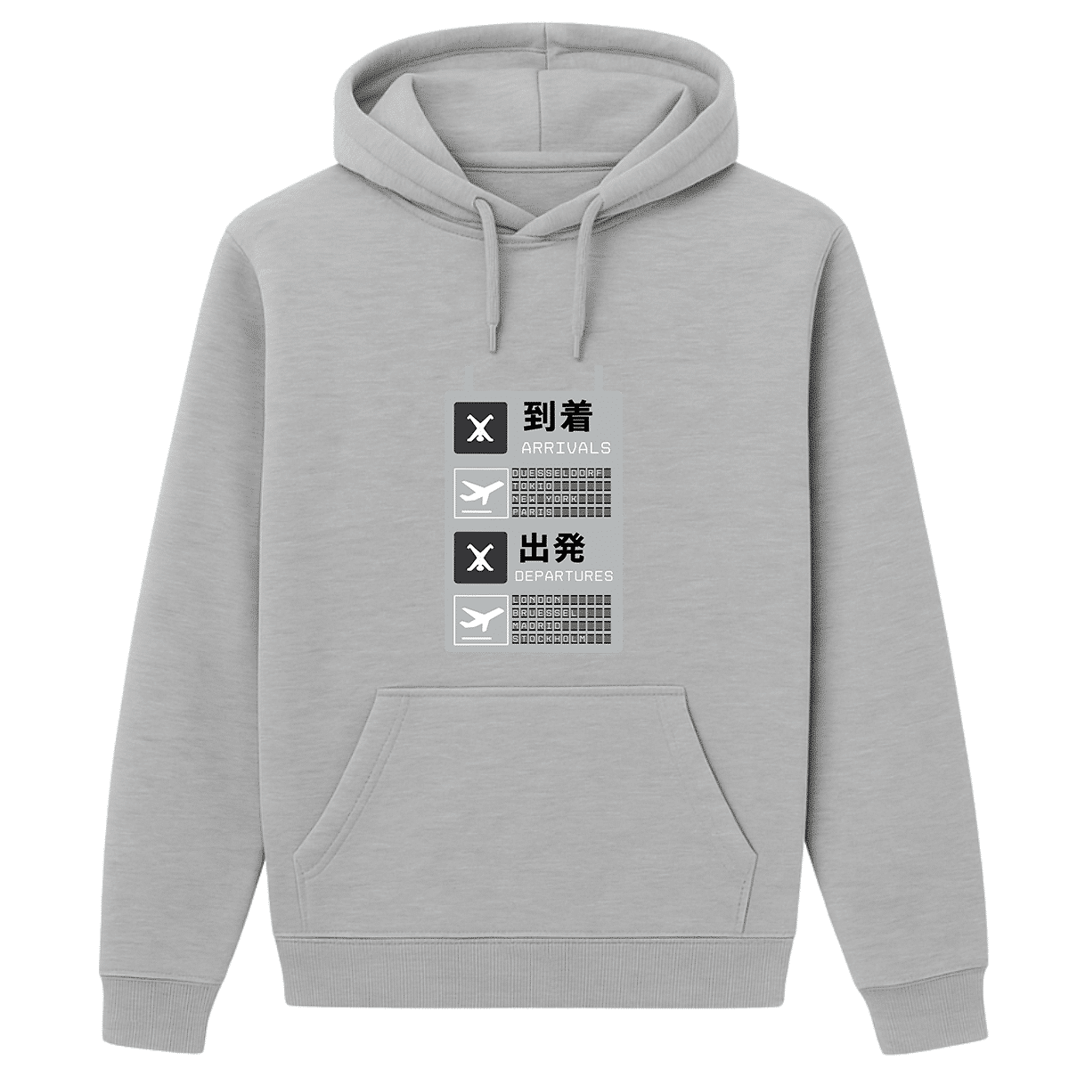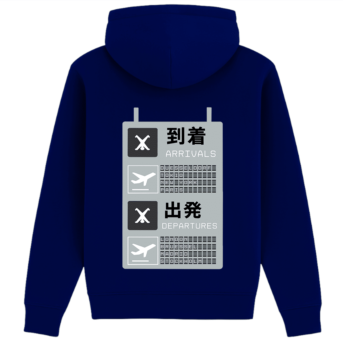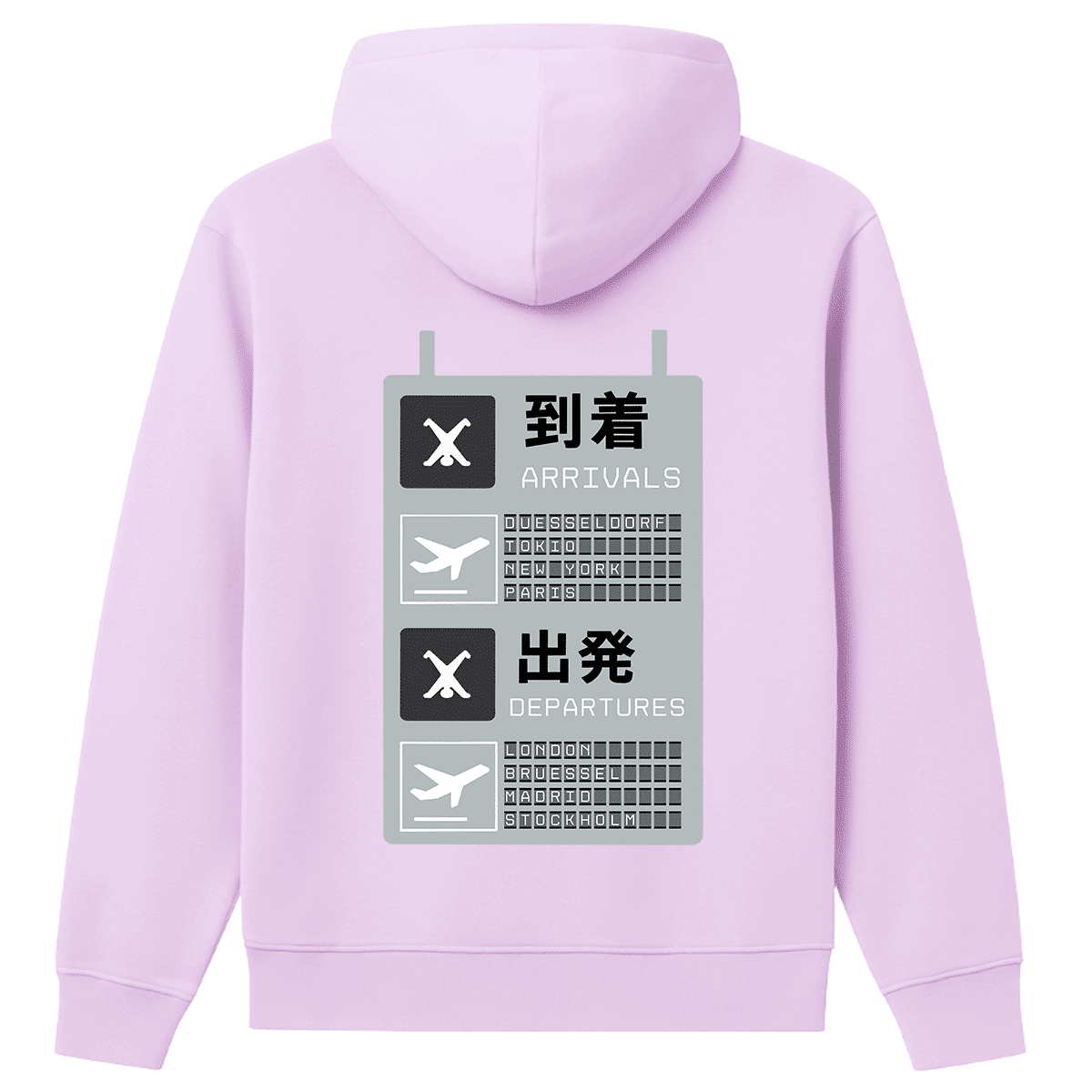 Für Globetrotter, Vielflieger und alle, die Fernweh lieben: Der Arrivals & Departures Hoodie bringt den coolen Look einer Anzeigetafel direkt in deinen Streetwear-Style.