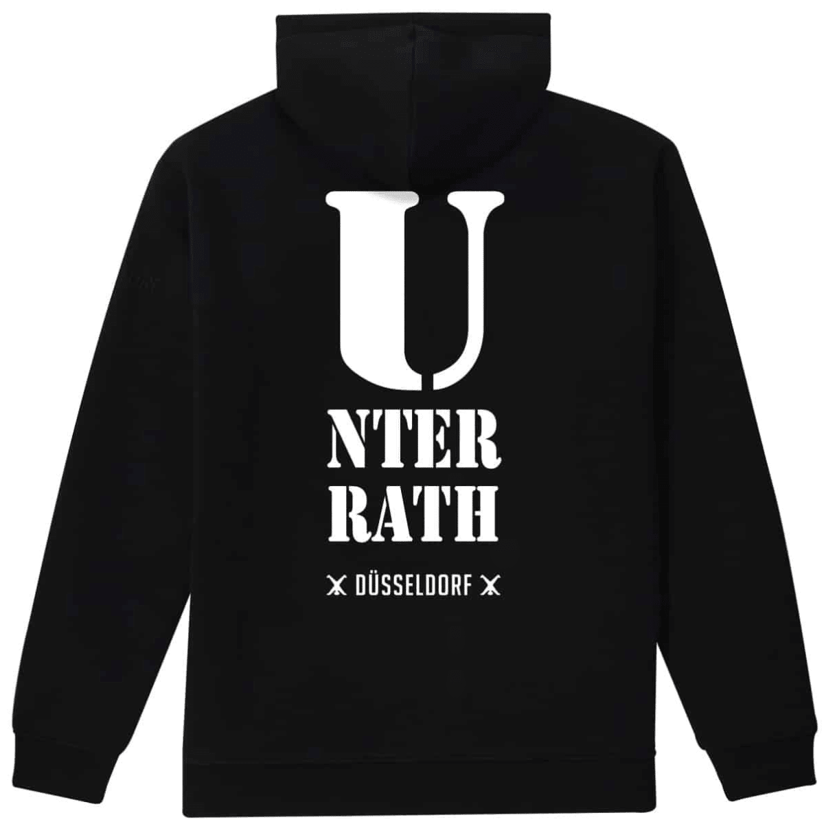 Das markante Typo-Design zieht sich in vertikaler Stapelung über den Rücken oder dezent auf der Brust, ergänzt durch ein dezentes „Düsseldorf“ mit Radschläger-Symbolen.