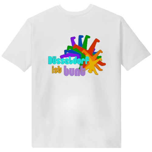 Dieses Shirt braucht keinen Subtext: „Düsseldorf ist bunt“ steht mittig auf der Brust, begleitet von