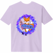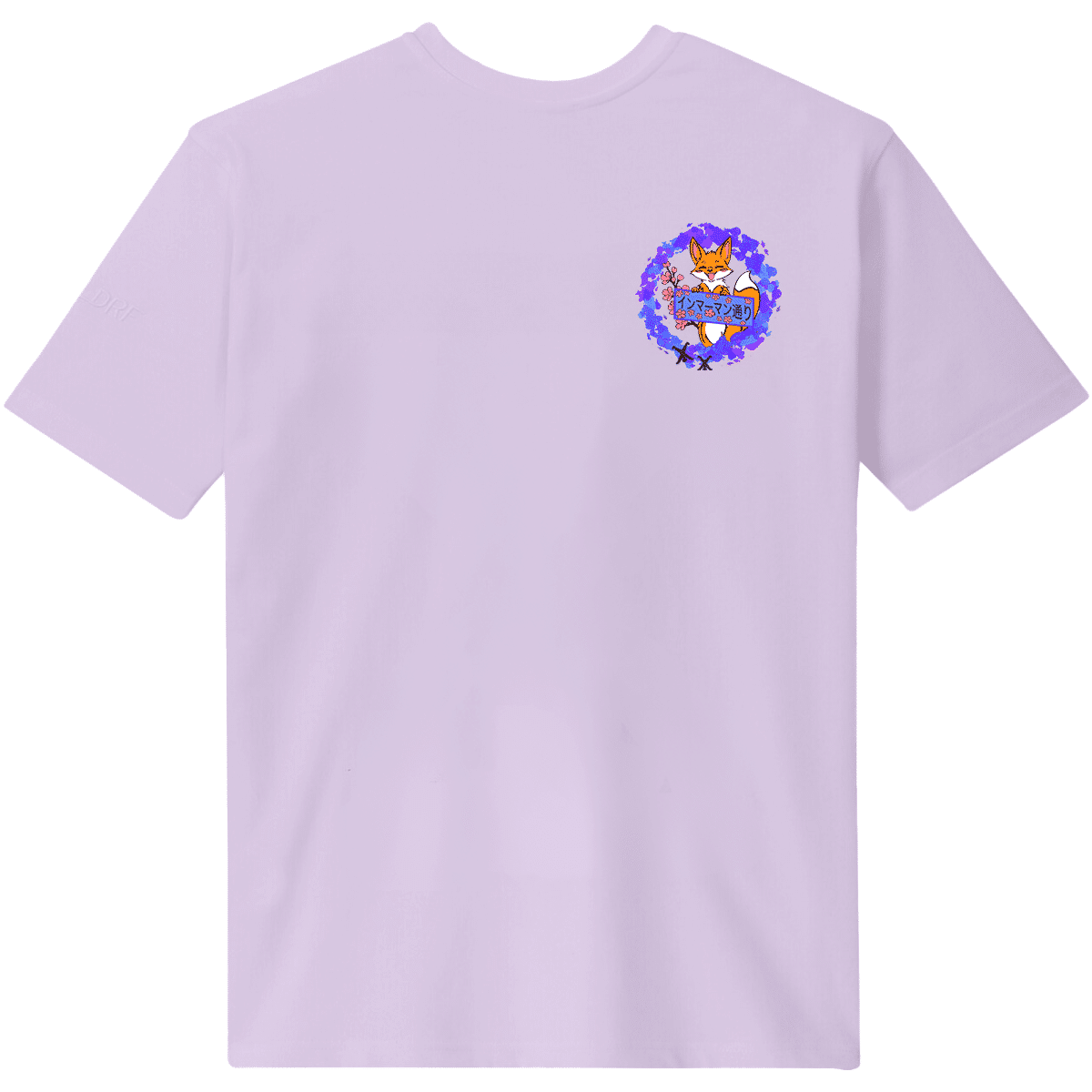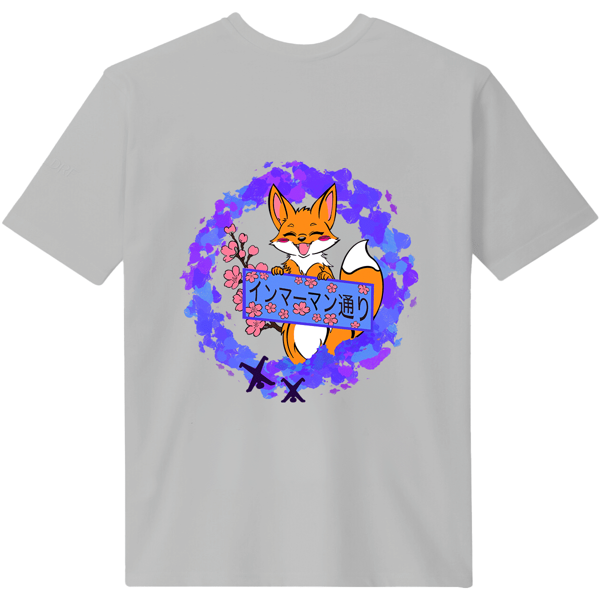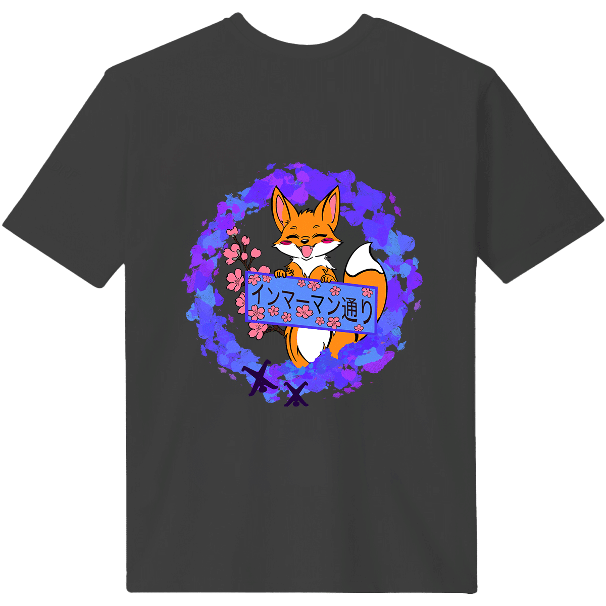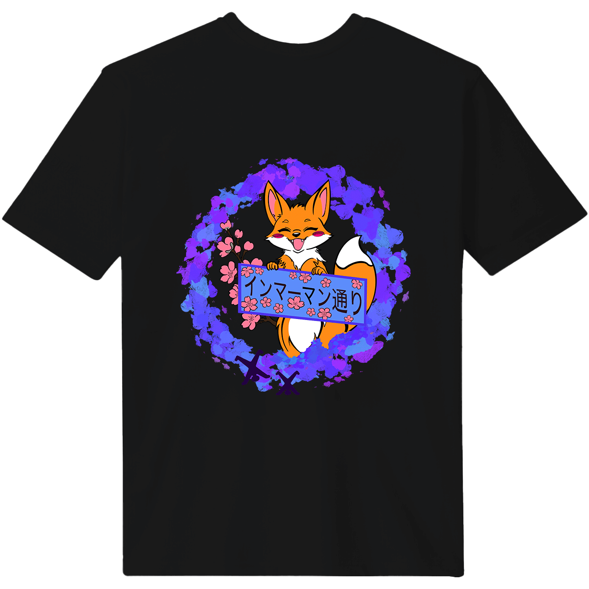 Frech, charmant, symbolisch: Ein verspielter Fuchs mit japanischem Straßenschild bringt Anime-Flair, Neonfarben und Düsseldorf-Vibe auf ein Shirt.