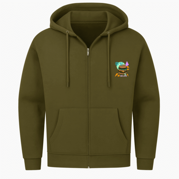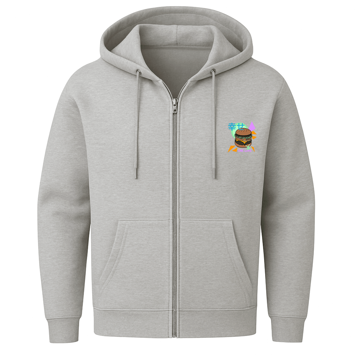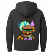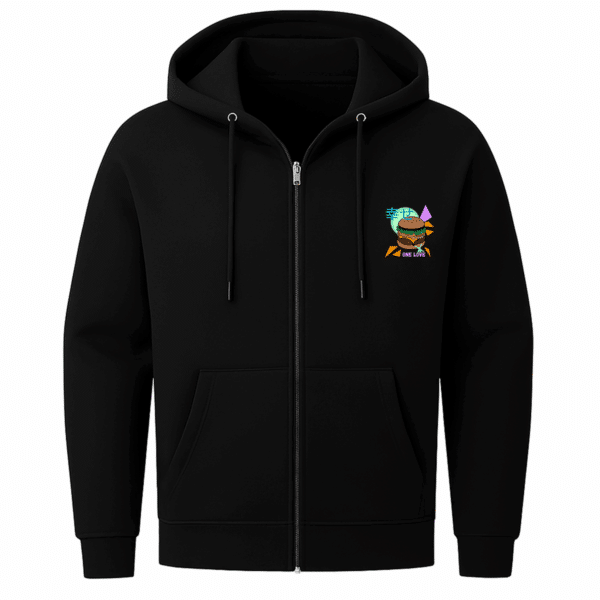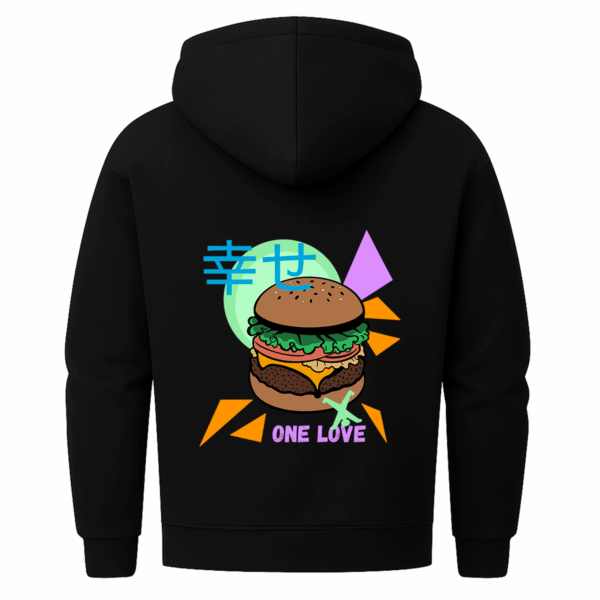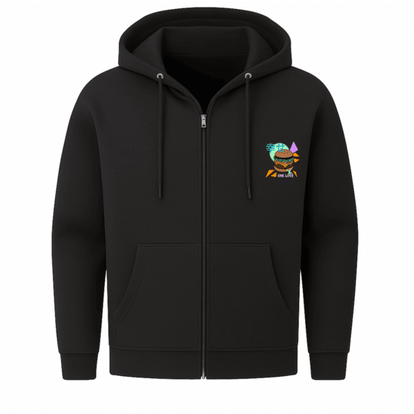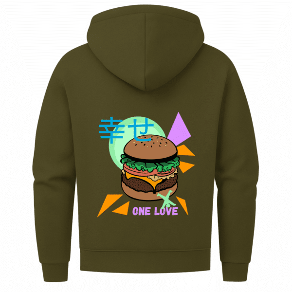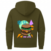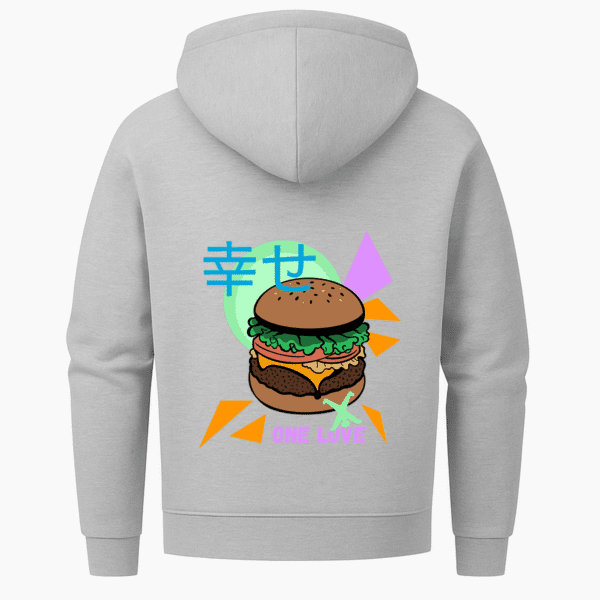 Neon, Nostalgie und ein Cheeseburger mit Haltung – dieser Zip-Hoodie mixt Pop-Art mit Heimatgefühl, Humor mit Fernweh und lässt den Radschläger mittendrin tanzen.