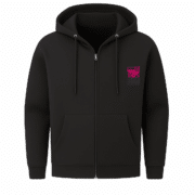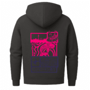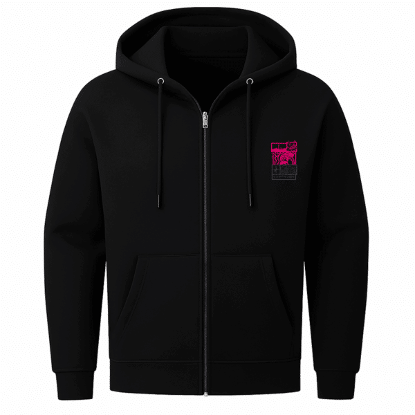 Dieser Zip-Hoodie erzählt von urbaner Nähe, stilisiertem Fernweh und gelebter Verbindung. Ausdrucksstark, kunstvoll, detailverliebt.