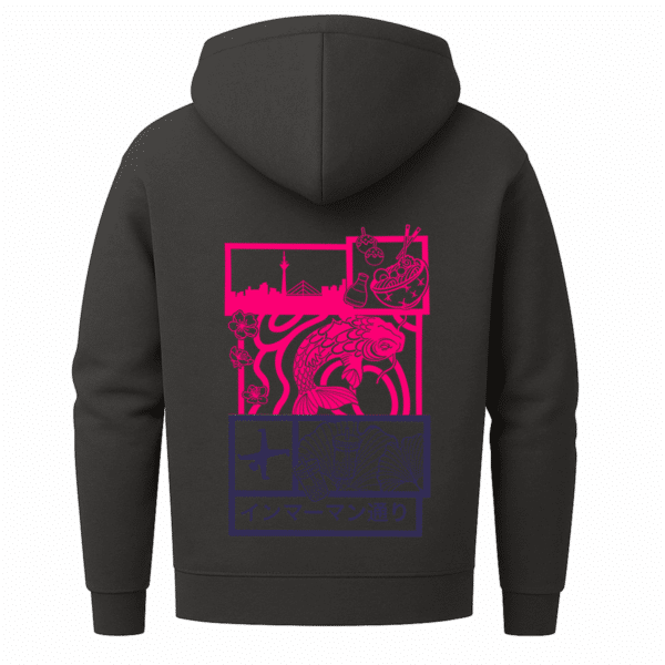 Zwischen Ramen, Rheinturm und Koi-Kraft – dieser Zip-Hoodie ist eine Collage aus Momenten, Symbolen und Fernweh, mitten aus der Immermannstraße.
