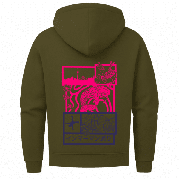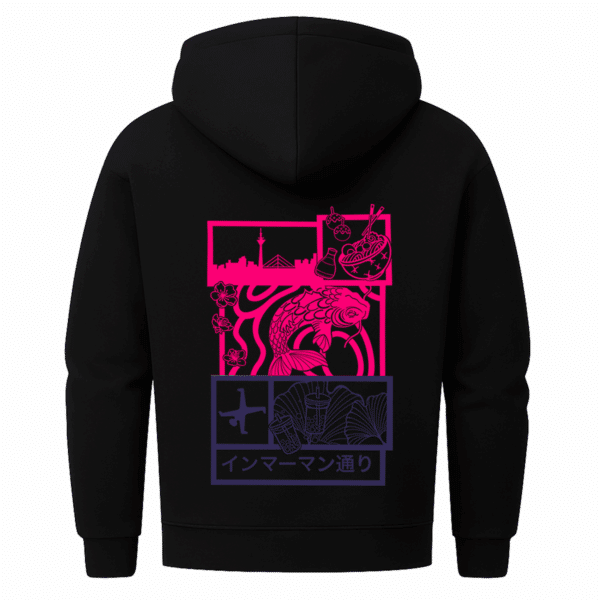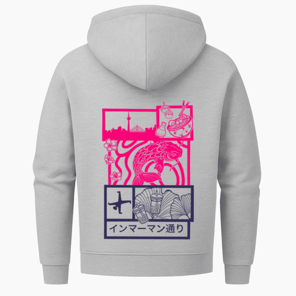 „Immermann Dreams“ ist ein visuelles Mosaik. Jedes Feld auf diesem Zip-Hoodie steht für einen Ausschnitt aus dem Gefühl, durch Japantown in Düsseldorf zu schlendern – Essen in der Hand, Sakura in der Luft, der Koi als Symbol für Kraft und Durchhaltevermögen.